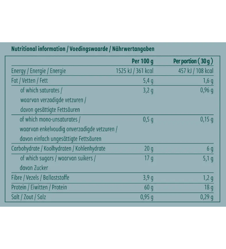 Ingredients: Whey protein concentrate* (milk) (74,8%), coconut blossom nectar*, cocoa powder (non-alkalised)*. *From organic farming.