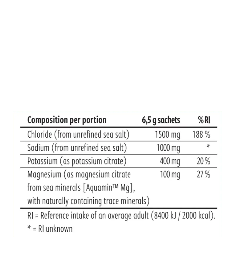 Unrefined sea salt, potassium citrate, magnesium citrate from sea minerals (Aquamin™ Mg Soluble), acidity regulator: citric acid, acidity regulator: malic acid, natural flavouring, sweetener: steviol glycosides of stevia.