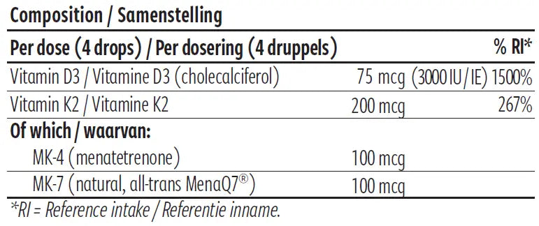 - 200 mcg vitamin K2 (267% RI*) of which: